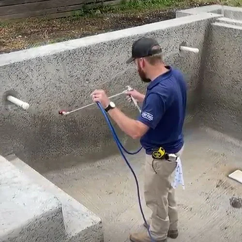 Creating a Permanent Internal Seal: After the pool shell cures, we apply a colloidal silicate treatment. This material penetrates the concrete and reacts with the naturally occurring lime, forming a permanent, insoluble gel within the concrete's pores and capillaries.