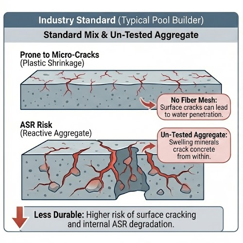Reactive Aggregate Testing (ASR Prevention): A major failure point in concrete is the Alkali-Silica Reaction (ASR), where reactive minerals in the aggregate swell and crack the concrete from the inside out. We require certification from our suppliers that the aggregate has been tested using the rigorous ASTM C1260 method. This ensures the stone used in your pool shell is non-reactive, greatly reducing the risk of ASR-related structural degradation years down the line.