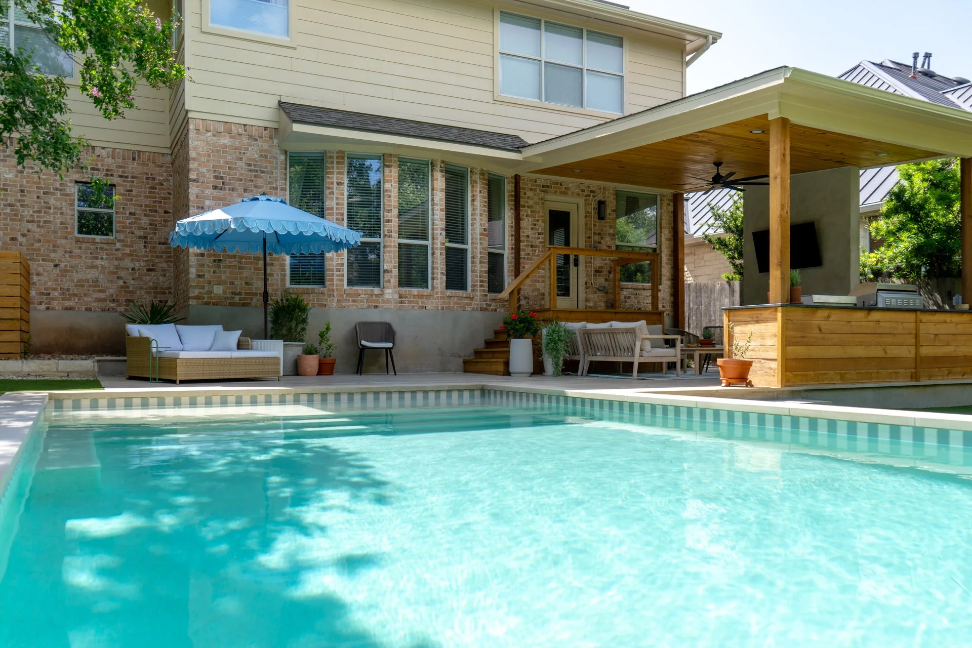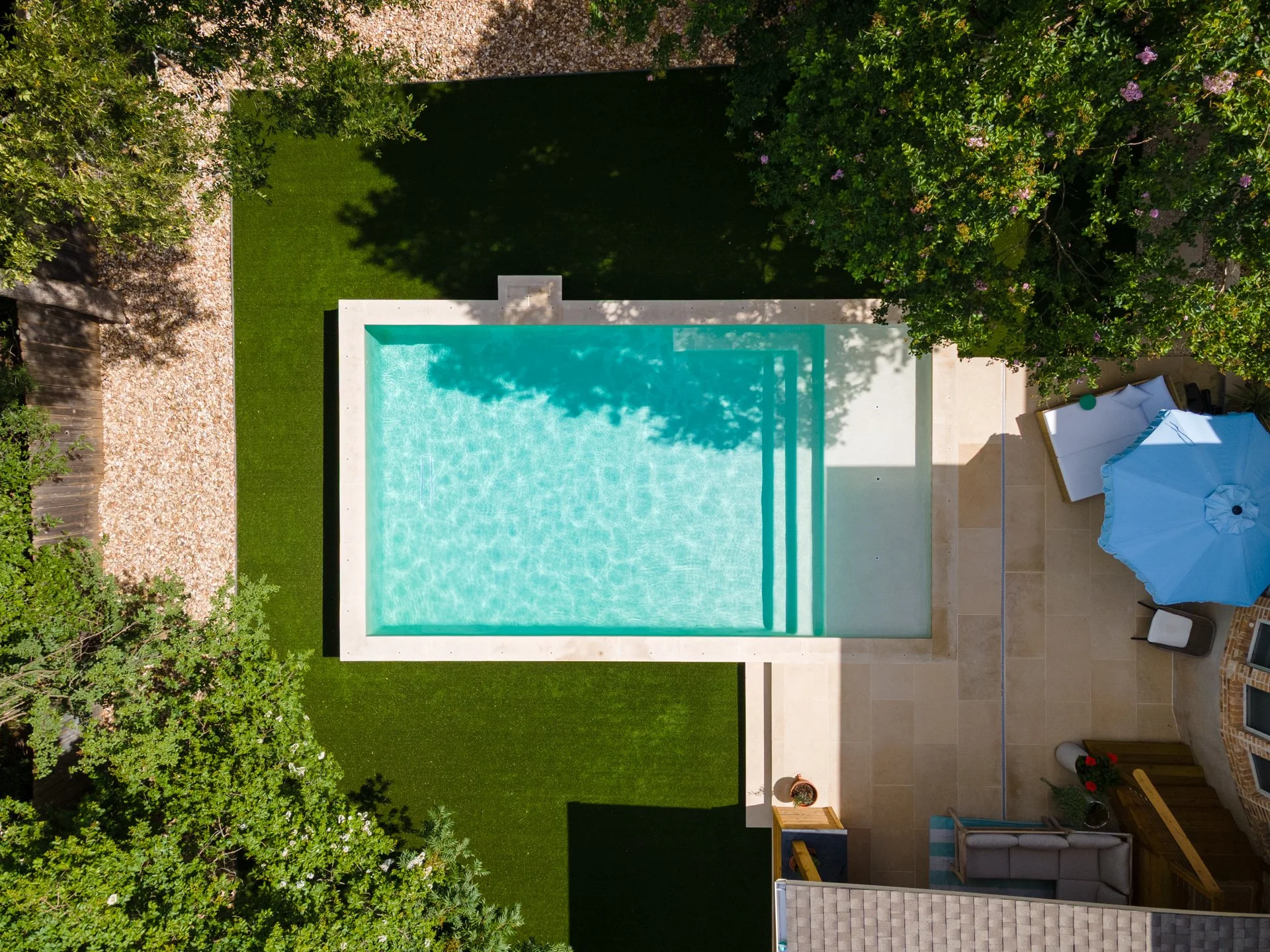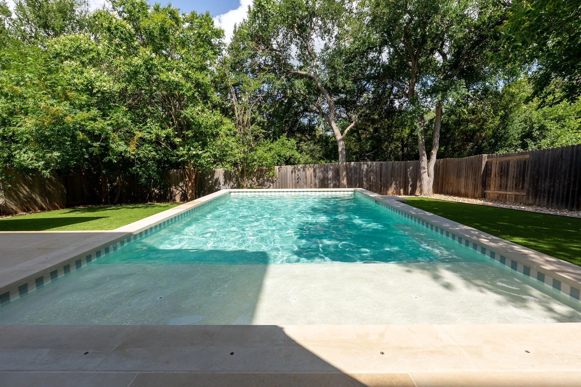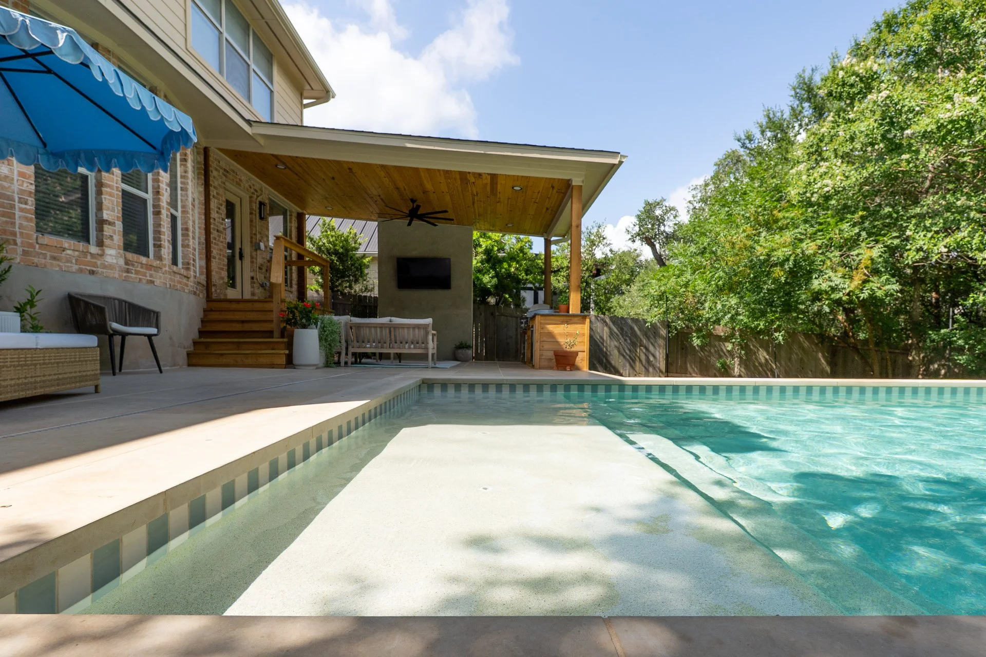 This 15'x27' stunner in Circle C Ranch features the same attention to detail, communication, and collaboration that we bring to every project, no matter the size. We removed an aging patio and pergola, then reimagined the space with a clean and modern layout, placing the pool at the heart of it all.