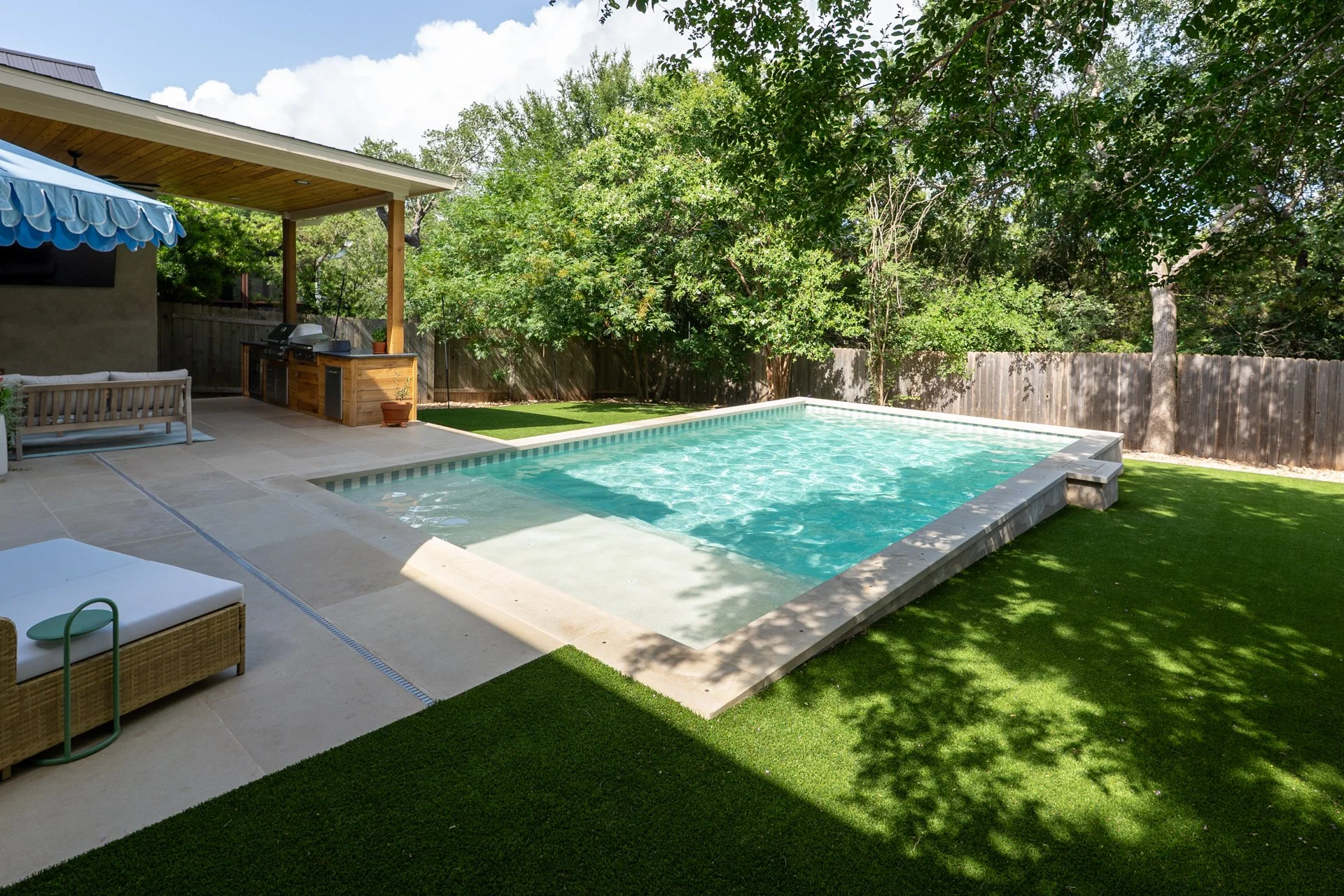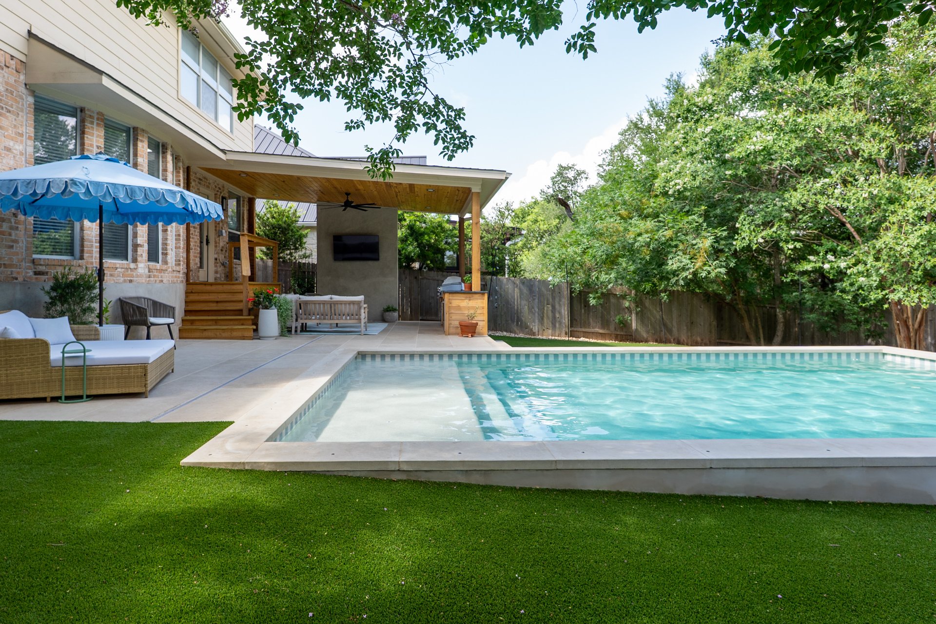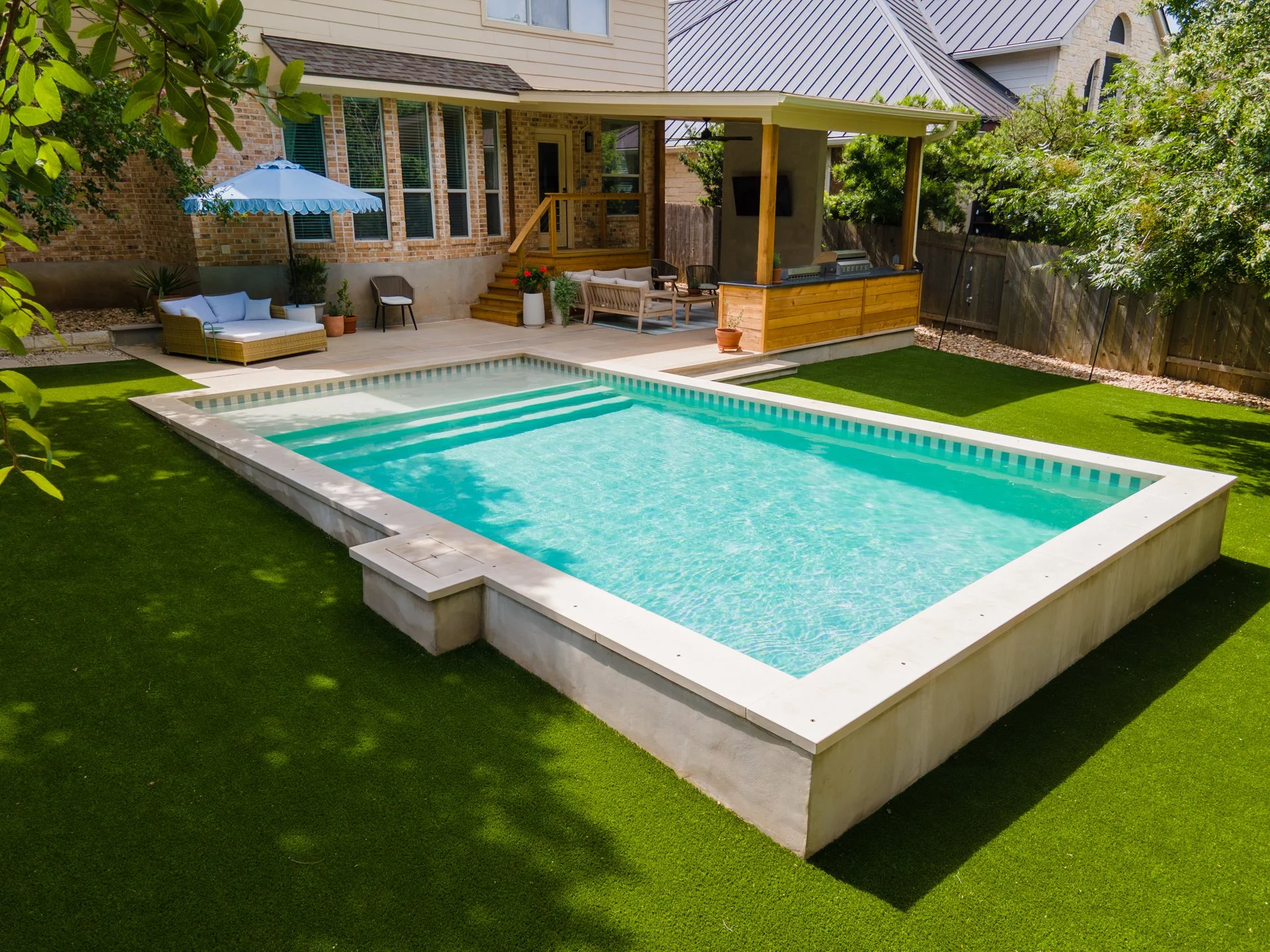After the pool was completed, our clients added artificial turf, while David Gomez Remodeling built the new outdoor kitchen and installed the surrounding hardscape. A true team effort—and a total backyard refresh.