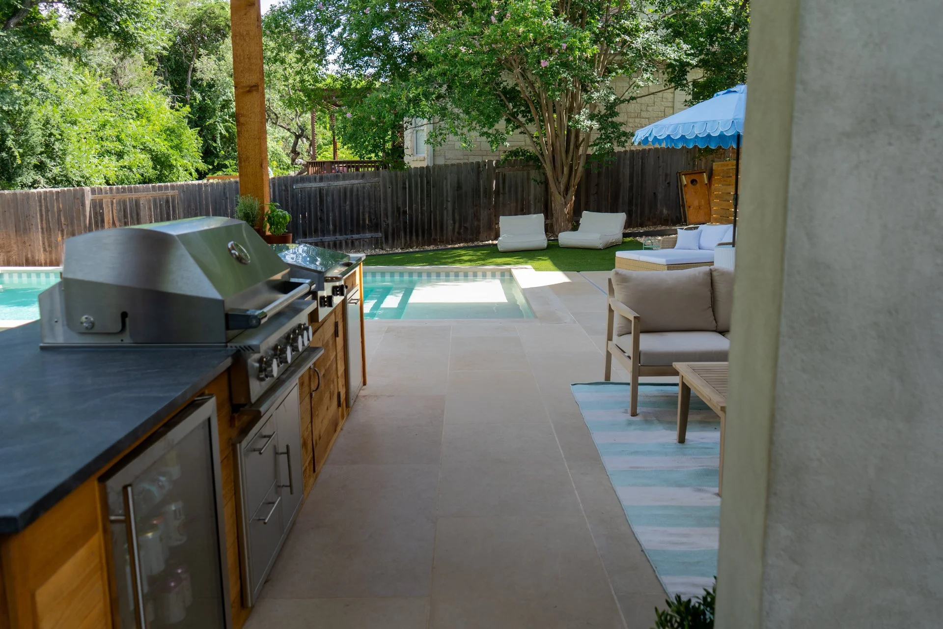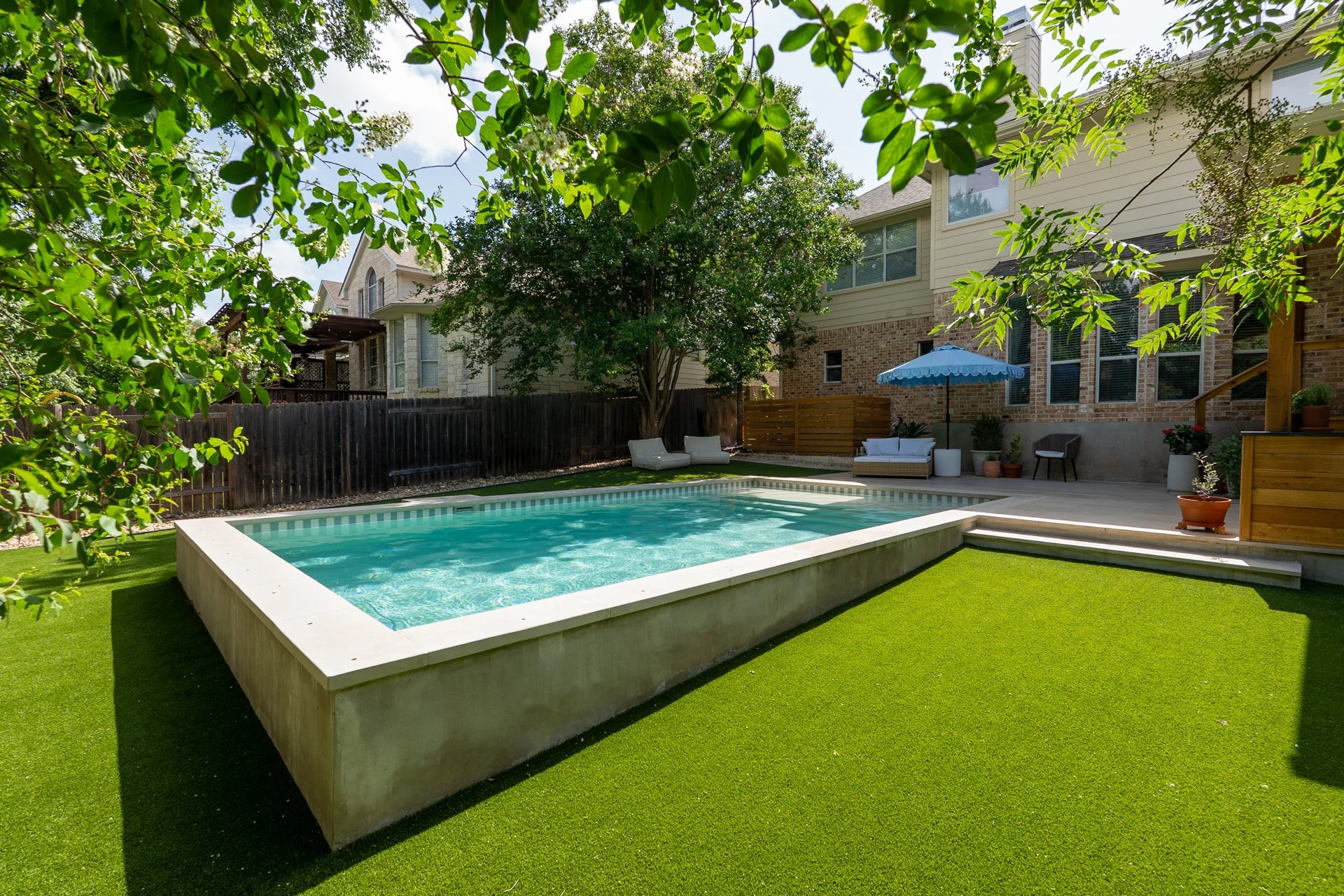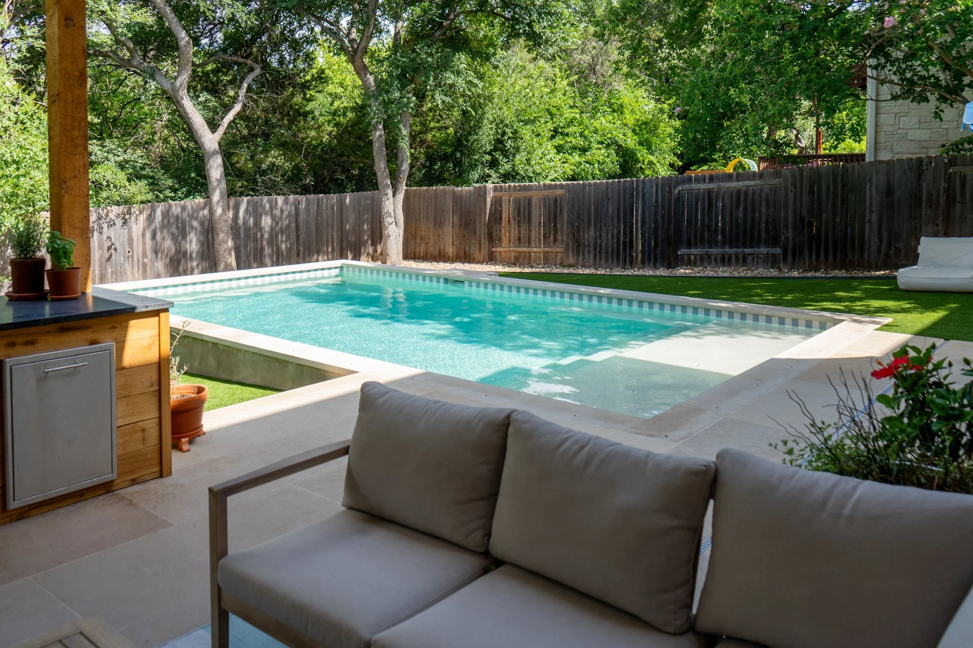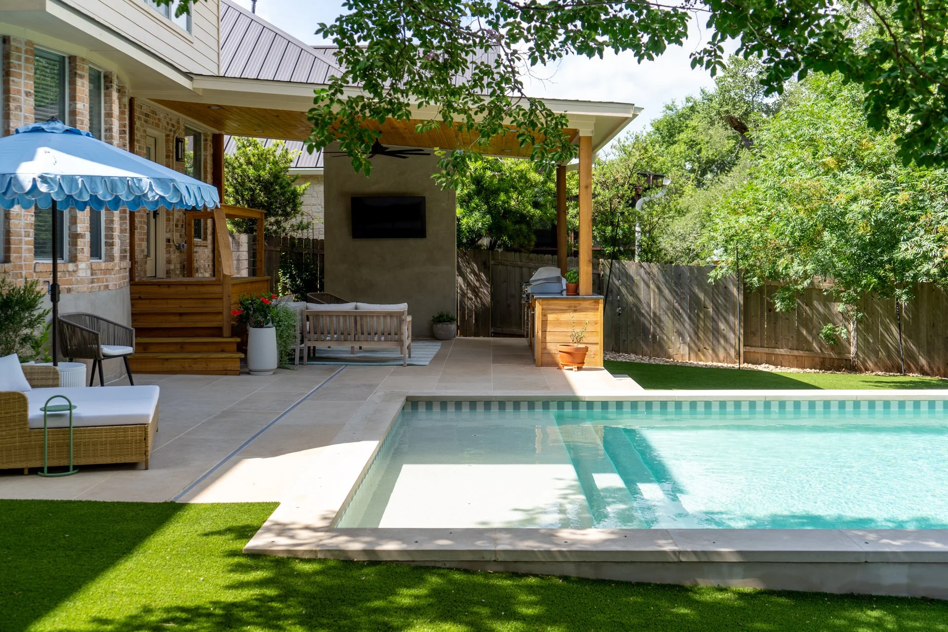 After the pool was completed, our clients added artificial turf, while David Gomez Remodeling built the new outdoor kitchen and installed the surrounding hardscape. A true team effort—and a total backyard refresh.